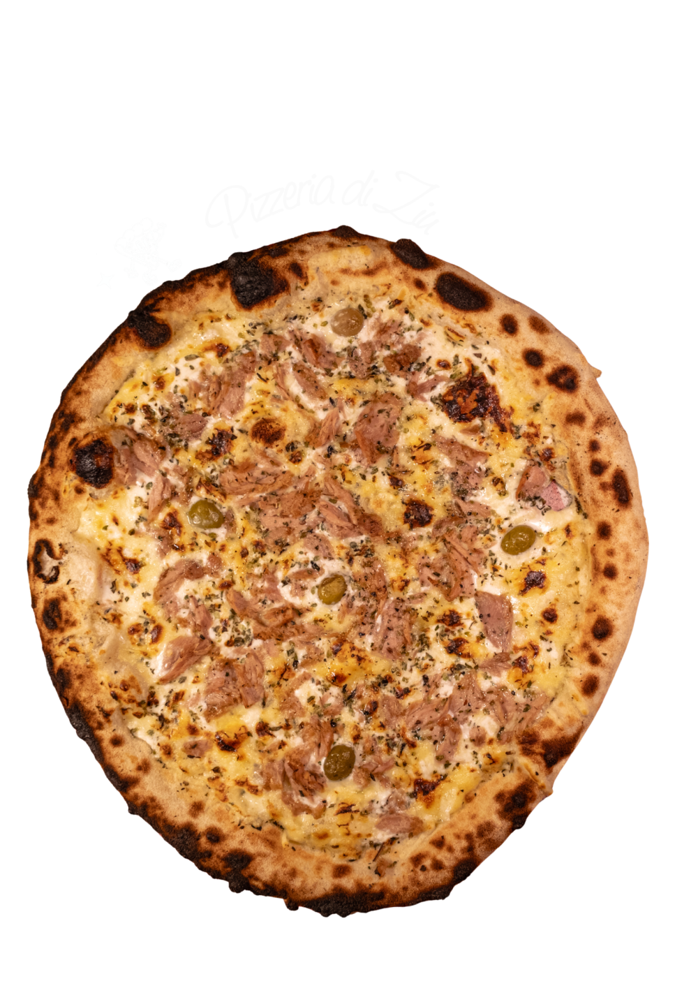 Crème fraîche, mozzarella fondante, thon émietté, éclats d’oignons rouges, herbes aromatiques.