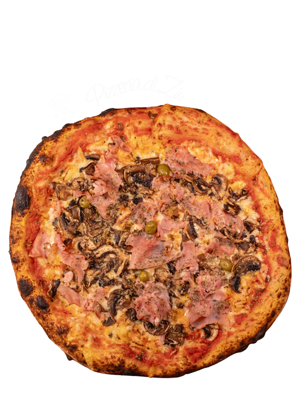 Sauce tomate maison, emmental, chiffonnade de jambon, champignons frais